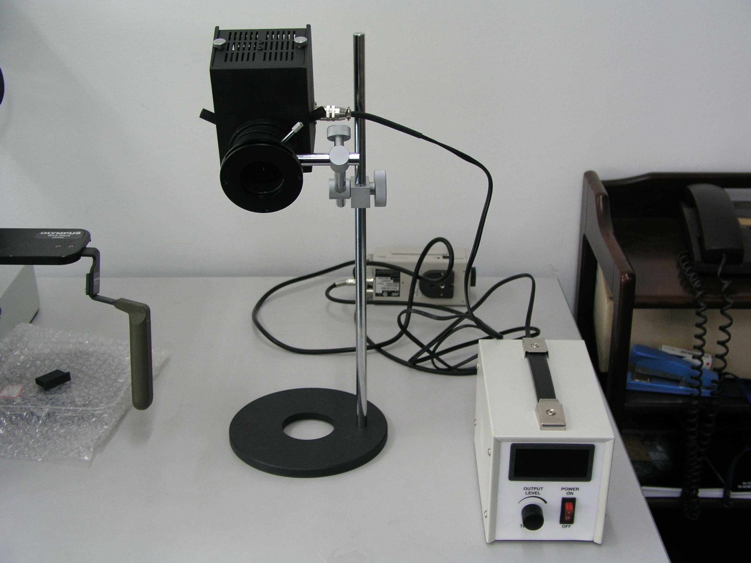 由外置的電源控制箱,將220V電壓轉(zhuǎn)換為12V電壓,給燈箱供電,使燈泡發(fā)光。并通過燈箱前段的集光鏡,使得光線由發(fā)散的光束轉(zhuǎn)變?yōu)榧械膹?qiáng)光束。